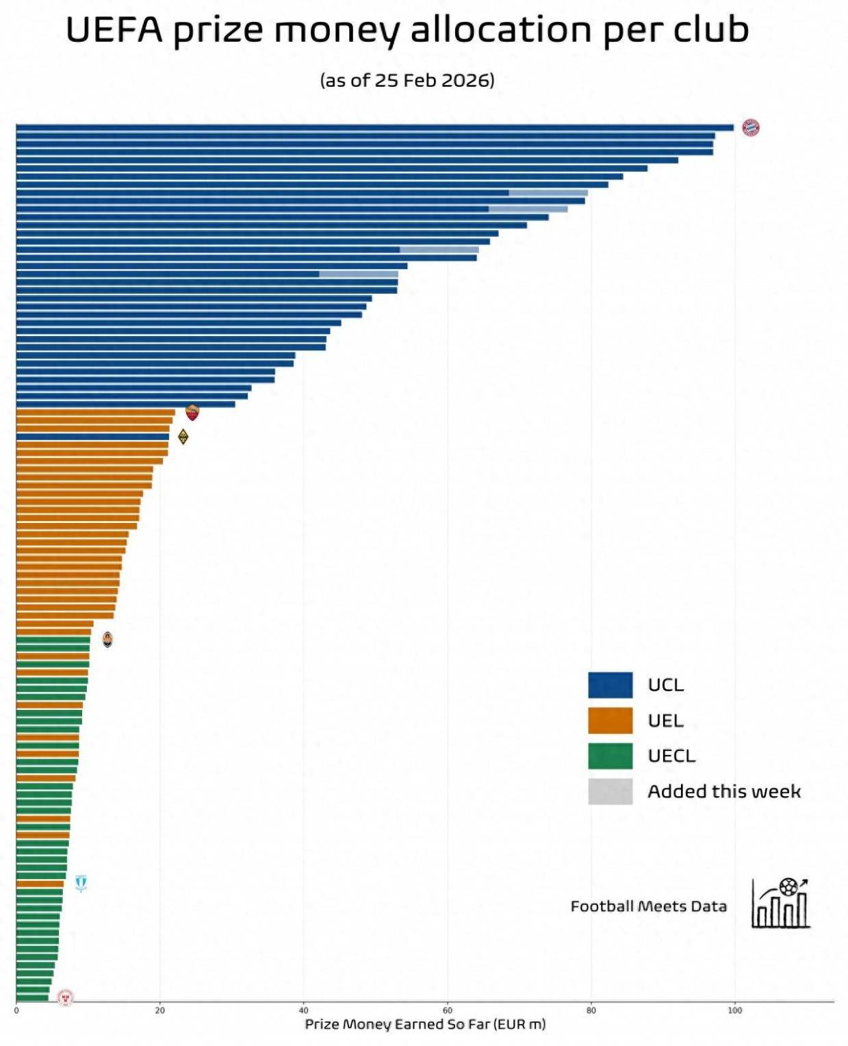 为什么欧洲各大联赛强队都在积极争夺欧冠名额?因为踢欧冠太赚钱了,即使在联赛阶段倒数第一也能拿上超2000万欧元的奖金,而拜仁这样的顶级强队,本赛季欧冠联赛阶段踢完就能拿上接近1亿欧元的奖金,真是赚钱如麻。专业数据媒体Footbal...