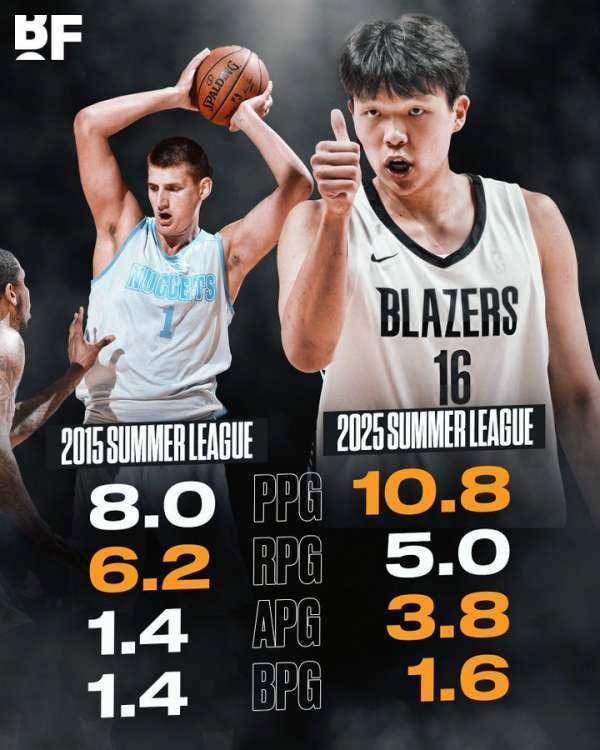 北京时间2025年7月21日,美媒晒出了杨瀚森与尼古拉-约基奇的夏联数据对比。2015年夏季联赛,约基奇场均8.0分6.2篮板1.4助攻与1.4封盖;2025年夏季联赛,杨瀚森场均10.8分5篮板3.8助攻1.6封盖。美媒给这次对...